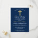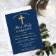 Invite your family and friends to your son's 1st Communion with this Elegant Gold Navy Blue Cross First Holy Communion Postcard Invitation. This design features a beautiful, simple golden cross against a classic dark blue background. Personalize the color and font and change the date and text to suit your needs. Perfect for a boy's 1st Communion.