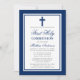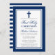 Elegant Navy Blue and Silver First Holy Communion Invitation with Cross. Striped Back.
