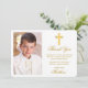 Elegant First Holy Communion Thank You Card with Gold Cross. Photo Front. Gold Text.