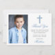 Elegant First Holy Communion Thank You Card with Silver Cross. Photo Front. Light Blue Script. Striped Back.