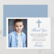Elegant First Holy Communion Thank You Card with Silver Cross. Photo Front. Light Blue Script.