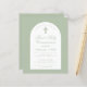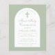 A modern first communion invitation. On sage green background, it has a white arch with green text inside. The occasion and the name are written in an elegant calligraphic script; the first line is arched text.