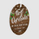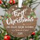 New home christmas tree ornament featuring a rustic wooden background, holly, snowflakes, string lights, your name, address, and the year. On the reverse is a photo for you to change to yourself.