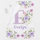 Design features the baby's Monogram & Name with Flowers either side in a water color pastel style. Initial is the letter E. Evelyn