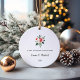 This simple yet stylish holiday ornament says "first married Christmas" along with the couples' names and wedding year in modern text and script. An elegant red and white Christmas floral bouquet with poinsettias and green leaves decorates the white background. A gorgeous keepsake for the newlywed couple!