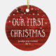 This rustic style ornament features a red wood look with wintry falling snow, and the words "Our First Christmas" in white modern typography. Add your names and year to the front, and personalize the back by adding your favorite photo of the two of you.
