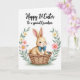 This card shows a gentle spring scene with a light-brown bunny 🐰 tucked cozily into a woven basket, its pink-lined ears perked and its round dark eyes giving a tender, friendly look. Soft rosy cheeks and a small curved smile make the little character feel like it’s sharing a quiet moment with someone special. A sky-blue bow tie sits neatly at the neck, adding a bright accent against the warm fur tones. Around the basket, a circular wreath of watercolor-style flowers frames the center, mixing pale pink and white blooms with leafy greens for a fresh garden feel 🌷. A faint pale-green wash beneath the basket suggests grass or a soft meadow floor without adding busy detail. Near the top, a congratulatory message about a first milestone is placed in a flowing, handwritten-style line, colored in a medium gray-blue that matches the bow tie. The basket’s woven texture is drawn with fine tan lines, and the wreath forms an even ring of petals and leaves around the bunny.