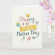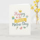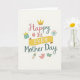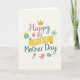 Designed with a crisp white background, this card centers a tall, vertically stacked message that reads “Happy 1st EVER Mother Day,” arranged like a gentle announcement for a new parent ❤️. “Happy” appears near the top in rosy red, “1st” sits beneath it in warm brown, and “Mother Day” follows in deep emerald green, giving the words a cozy, affectionate rhythm. “EVER” runs across the middle in white letters on a bright yellow banner that slices through the layout like a cheerful ribbon. Around the text, small baby-themed icons and soft shapes create a sweet, close-to-the-heart scene, including two little crowns—one golden and one outlined in teal—that hint at a cherished new role. A teal dotted rectangle, a pink ball with tiny red speckles, and a pastel flower burst add gentle movement, like confetti drifting through a quiet celebration 🌼. A baby bottle with an orange top and teal band sits nearby, paired with a small pink animal figure that feels like a comforting bedside toy. The accents are scattered evenly around the lettering, with teal, pink, yellow, and muted green details balancing the space.