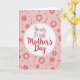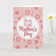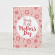 This greeting card features a white circular badge at the center with the words “Your First Mother’s Day” written in flowing lettering. “Your First” appears in a soft rose color, while “Mother’s Day” is set in a deeper red, creating a gentle contrast that feels affectionate ❤️. Behind the badge, the background is filled with light pink vertical stripes that add a soft, cozy texture. Scattered across the stripes are stylized flowers in dusty rose and deeper blush tones, suggesting a bouquet arranged with care. Larger blooms include cream-colored centers with tiny stamen details, while smaller blossoms fill the gaps like little reminders of closeness. Slender vines curl between the flowers with tiny leaves and small heart shapes in brighter red, adding a sweet, friendly note 🌼. The central badge sits neatly over the patterned field, and the red heart accents repeat in several spots near the vines and petals.