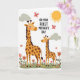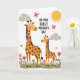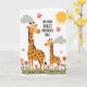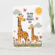 This Mother's Day card shows two long-necked animals in a friendly cartoon style, one taller and one smaller, standing close with rosy cheeks and a gentle, caring look between them ❤️. Their coats are mottled in warm golden ochre and rich sienna, outlined with simple dark lines against a white background. Along the bottom, a strip of green grass is sprinkled with small pink and orange flowers, adding a sweet, garden-like setting 🌼. Near the top, a round yellow sun sits above the pair, with a couple of soft gray clouds nearby. Two small coral-pink butterflies flutter in the sky, giving the scene a light, affectionate energy. The message “ON YOUR FIRST MOTHER'S DAY” appears in bold black lettering across the center, sitting between the sky elements and the animals. The letters are evenly spaced and easy to read, standing out clearly against the white space. The taller animal stands on the left with the smaller one tucked close at its side, both smiling above the grassy flowers.