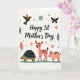 Designed with a creamy off-white background, the card centers a large line of text that reads “Happy 1st Mother’s Day” in dark, flowing lettering that feels tender and close ❤️. Beneath the message, three cute, stylized animals stroll across the lower third like a small parade shared between friends. On the left, a smiling tortoise with a dark, domed shell leads the way, its calm expression giving the scene a gentle, caring tone. Next comes a coral-pink, deer-like animal with black spots and a tiny dark crown, angled as if leaning toward the others in friendly company. To the right, a rosy pink piglet with darker spots follows with a bright, open look that adds warmth to the group 🌼. In the upper corners, a simple brown bird glides at the left while a dark butterfly hovers at the right, echoing the soft, affectionate energy below. Muted green and rosy leaves and small pastel dots are scattered around them like light confetti, with the tortoise, crowned deer-like figure, and spotted piglet lined up along the bottom edge.