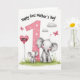 This Mother's Day card features a tall number “1” in soft pastel pink with small white polka dots, standing like a milestone at the center of a white background. At its base, two light gray cartoon elephants sit together on a green patch of grass, the larger one leaning in with a gentle smile and rosy cheeks while the smaller one curls its tiny trunk toward her in a sweet, close moment ❤️. Near the top, the message “Happy first Mother’s Day!” curves in a flowing cursive-style font, set in dark lettering that stands out clearly. On the left side, a pink heart-shaped balloon floats with “2026” written on it, tied down by a thin black string. A few bright pink butterflies drift above the elephants, adding motion and a light, affectionate feel to the scene 🌼. Soft gray clouds spread across the upper area, keeping the sky calm and airy. Along the bottom edge, the grass strip is dotted with small blue and white wildflowers.