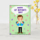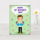 This greeting card shows a cheerful family moment, with a broad-shouldered man standing front and center, cheeks rosy and mouth open in a big smile as he looks down with a tender, affectionate gaze. He wears a white shirt with a green tie and dark pants, giving the scene a dressed-up, celebratory feel. In his arms, two infants are cuddled close, each wrapped in bright blue blankets with small, calm faces peeking out, adding a cozy sense of closeness ❤️. Above the group, a large white speech-bubble shape floats near the top, holding the message “HAPPY 1ST MOTHER’S DAY!” in purple lettering. The text sits neatly centered inside the bubble, easy to read against the white space. Behind them is a soft pastel green background dotted with simple flower shapes in pink, orange, and lavender, like a gentle spring garden 🌼. A black-and-white striped border frames the entire design, creating a crisp edge around the pastel scene.