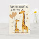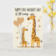 This card shows two stylized, long-necked spotted animals on a creamy backdrop, with the taller golden-yellow one standing on the right like a gentle guardian. On the left, the smaller companion leans in close, holding two sepia heart-shaped balloons, and the pair’s soft, affectionate pose suggests a close bond ❤️. Warm yellows and earthy browns keep the scene cozy, while faint, diffused lighting smooths the edges and adds a calm glow. Small five-pointed stars in a muted sepia tone are scattered around them, echoing the balloon color and adding a dreamy touch. Across the top, the message “HAPPY FIRST MOTHER'S DAY AS MY nanny” appears in uppercase lettering, set in a dark brown tone that stands out against the light background. The text sits above the characters like a headline, leaving the animals centered and unobstructed beneath it. A gentle pink blush on the smaller animal’s cheek, paired with the floating hearts and tiny stars, creates a sweet, caring scene 🌼. The two heart balloons rise slightly above the smaller figure’s head, their thin strings curving down toward its front hooves.