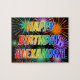 This vibrant and exciting birthday-themed jigsaw puzzle design features the message "HAPPY BIRTHDAY, ALEXANDRA" having a colorful rainbow spectrum inspired gradient pattern, and a fun bursting celebratory fireworks inspired background pattern. A vibrant puzzle like this might be a fun way to send birthday greetings to somebody named Alexandra. [~Z0000465]