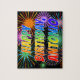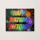 This vibrant, fun, birthday-themed jigsaw puzzle design has the message "HAPPY BIRTHDAY, ANTONIO" having a colorful rainbow spectrum inspired gradient pattern, and a lively bursting celebratory fireworks inspired background pattern. A colorful puzzle like this might be a fun way to send a birthday greeting message to somebody named Antonio. [~Z0000465]