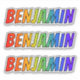 This multicolored, vibrant, and exciting sticker design features the common first name or given name "BENJAMIN", with the letters of the name having a colorful rainbow spectrum like gradient coloring pattern. It might be a fun gift to give to somebody who is named Benjamin. [~Z0000361]