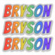 This fun, multicolored, and exciting sticker design features the common first name or given name "BRYSON", with the letters of the name featuring a colorful rainbow spectrum like gradient coloring pattern. It might be a fun gift to give to somebody named Bryson. [~Z0000361]