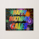 This fun, vibrant, birthday-themed jigsaw puzzle design has the message "HAPPY BIRTHDAY, CALEB" having a colorful rainbow spectrum inspired gradient pattern, and a lively bursting celebratory fireworks inspired background pattern. A colorful puzzle like this might be a fun way to send a birthday greeting message to somebody named Caleb. [~Z0000465]