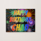 This fun, vibrant, birthday-themed jigsaw puzzle design features the message "HAPPY BIRTHDAY, CHAD" having a colorful rainbow spectrum inspired gradient pattern, and a lively bursting celebratory fireworks inspired background pattern. A vibrant puzzle like this might be a fun way to acknowledge the birthday of somebody named Chad. [~Z0000465]