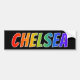 This multicolored and fun bumper sticker design features the common first name "CHELSEA" with the letters having a colorful rainbow spectrum like gradient coloring pattern. The background is colored black. A bumper sticker like this might be a fun present to give to somebody whose first name is Chelsea. [~Z0000343]