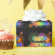 This vibrant and lively birthday-themed wrapping paper design has the message "HAPPY BIRTHDAY, DAVID" having a colorful rainbow spectrum inspired gradient pattern, and an exciting bursting celebratory fireworks inspired background pattern. Vibrant wrapping paper like this might be used when wrapping gifts/presents that are being given in celebration of the birthday of somebody named David. [~Z0000456]