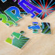 This lively and fun birthday-themed jigsaw puzzle design has the message "HAPPY BIRTHDAY, DEBRA" having a colorful rainbow spectrum inspired gradient pattern, and an exciting bursting celebratory fireworks inspired background pattern. A colorful puzzle like this might be used to send birthday greetings to somebody named Debra. [~Z0000465]