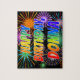 This exciting, lively, birthday-themed jigsaw puzzle design features the message "HAPPY BIRTHDAY, DONNA" having a colorful rainbow spectrum inspired gradient pattern, and a fun bursting celebratory fireworks inspired background pattern. An exciting puzzle like this might be a fun way to acknowledge the birthday of somebody named Donna. [~Z0000465]