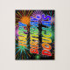 This fun, vibrant, birthday-themed jigsaw puzzle design features the message "HAPPY BIRTHDAY, DOUGLAS" having a colorful rainbow spectrum inspired gradient pattern, and a lively bursting celebratory fireworks inspired background pattern. A colorful puzzle like this might be a fun way to send a birthday greeting message to somebody named Douglas. [~Z0000465]