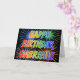 This multicolored and fun birthday greeting card design features the message "HAPPY BIRTHDAY," and the common first name "GABRIELLE" with the letters having a colorful rainbow spectrum like gradient coloring pattern. The background of the front also features a colorful pattern inspired by the appearance of bursting fireworks. The inside features a personalized greeting message, or could perhaps be cleared and left blank if a message is to be written by hand instead. A birthday greeting card like this could be a fun way to send a customizable birthday greeting message to somebody named Gabrielle. [~Z0000350]