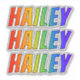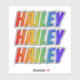 This exciting, vibrant, and multicolored sticker design features the common first name or given name "HAILEY", with the letters of the name having a colorful rainbow spectrum like gradient coloring pattern. It might be a fun gift to give to somebody named Hailey. [~Z0000361]