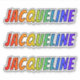 This fun, exciting, and vibrant sticker design features the common first name or given name "JACQUELINE", with the letters of the name having a colorful rainbow spectrum like gradient coloring pattern. It might be a fun present to give to somebody who is named Jacqueline. [~Z0000361]