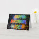This multicolored and fun birthday greeting card design features the message "HAPPY BIRTHDAY," and the common first name "JOEL" with the letters having a colorful rainbow spectrum like gradient coloring pattern. The background of the front also features a colorful bursting fireworks inspired pattern. The inside features a custom greeting message, or could perhaps be cleared and left blank if a message is to be written by hand instead. A birthday greeting card like this might be a fun way to acknowledge the birthday of somebody named Joel. [~Z0000350]