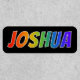 This exciting, multicolored, and vibrant name patch design features the common first name "JOSHUA", with the letters of the name having a colorful rainbow spectrum styled gradient coloring pattern, on a black colored background. It might be a fun gift to give to somebody whose first name is Joshua. [~Z0000505]