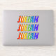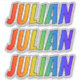 This vibrant, multicolored, and exciting sticker design features the common first name or given name "JULIAN", with the letters of the name having a colorful rainbow spectrum like gradient coloring pattern. It might be a fun present to give to somebody who is named Julian. [~Z0000361]