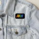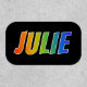 This vibrant and exciting name patch design features the common first name "JULIE", with the letters of the name having a colorful rainbow spectrum inspired gradient coloring pattern, on a black colored background. It might be a fun gift to give to somebody named Julie. [~Z0000505]