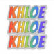 This fun, multicolored, and exciting sticker design features the common first name or given name "KHLOE", with the letters of the name featuring a colorful rainbow spectrum like gradient coloring pattern. It might be a fun gift to give to somebody named Khloe. [~Z0000361]