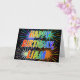 This vibrant, multicolored and fun birthday greeting card design features the message "HAPPY BIRTHDAY," and the common first name "LIAM" with the letters having a colorful rainbow spectrum like gradient coloring pattern. The background of the front also features a colorful bursting fireworks inspired pattern. The inside features a customized greeting message, or could perhaps be cleared and left blank if a message is to be written by hand instead. A birthday greeting card like this might be a fun way to acknowledge the birthday of somebody named Liam. [~Z0000350]