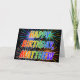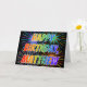 This fun, vibrant, multicolored birthday greeting card design features the message "HAPPY BIRTHDAY," and the common first name "MATTHEW" with the letters having a colorful rainbow spectrum like gradient coloring pattern. The background of the front also features a colorful bursting fireworks inspired pattern. The inside features a customizable greeting message, or could perhaps be cleared and left blank if a message is to be written by hand instead. A greeting card like this could be a fun way to acknowledge the birthday of somebody named Matthew. [~Z0000350]