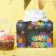 This lively and vibrant birthday-themed wrapping paper design has the message "HAPPY BIRTHDAY, MAX" having a colorful rainbow spectrum inspired gradient pattern, and an exciting bursting celebratory fireworks inspired background pattern. Vibrant wrapping paper like this might be used when wrapping presents or gifts being given in celebration of the birthday of somebody named Max. [~Z0000456]