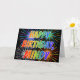 This multicolored and fun birthday greeting card design features the message "HAPPY BIRTHDAY," and the common first name "MINDY" with the letters having a colorful rainbow spectrum like gradient coloring pattern. The background of the front also features a colorful bursting fireworks inspired pattern. The inside features a customizable greeting message, or could perhaps be cleared and left blank if a message is to be written by hand instead. A birthday greeting card like this might be a fun way to acknowledge the birthday of somebody named Mindy. [~Z0000350]