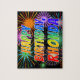This fun and exciting birthday-themed jigsaw puzzle design features the message "HAPPY BIRTHDAY, RHONDA" having a colorful rainbow spectrum inspired gradient pattern, and a vibrant bursting celebratory fireworks inspired background pattern. A colorful puzzle like this might be a fun way to send birthday greetings to somebody named Rhonda. [~Z0000465]