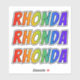 This multicolored, vibrant, and exciting sticker design features the common first name or given name "RHONDA", with the letters of the name having a colorful rainbow spectrum inspired gradient coloring pattern. It might be a fun present to give to somebody named Rhonda. [~Z0000361]
