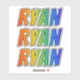 This exciting, multicolored, and vibrant sticker design features the common first name or given name "RYAN", with the letters of the name featuring a colorful rainbow spectrum like gradient coloring pattern. It might be a fun gift to give to somebody whose given name is Ryan. [~Z0000361]