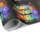 This vibrant and fun birthday-themed wrapping paper design features the message "HAPPY BIRTHDAY, SHELBY" having a colorful rainbow spectrum inspired gradient pattern, and an exciting bursting celebratory fireworks inspired background pattern. Fun wrapping paper like this might be used when preparing presents/gifts being given to celebrate the birthday of somebody named Shelby. [~Z0000456]