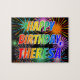 This vibrant, fun, birthday-themed jigsaw puzzle design has the message "HAPPY BIRTHDAY, THERESA" having a colorful rainbow spectrum inspired gradient pattern, and an exciting bursting celebratory fireworks inspired background pattern. A colorful puzzle like this might be a fun way to send birthday wishes to somebody named Theresa. [~Z0000465]