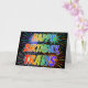 This fun, vibrant, multicolored birthday greeting card design features the message "HAPPY BIRTHDAY," and the common first name "TRAVIS" with the letters having a colorful rainbow spectrum like gradient coloring pattern. The background of the front also features a colorful pattern inspired by the appearance of bursting celebratory fireworks. The inside features a customized greeting message, or could perhaps be cleared and left blank if a message is to be written by hand instead. A birthday greeting card like this could be fun to give to somebody named Travis on their birthday. [~Z0000350]