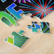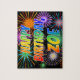 This exciting, vibrant, birthday-themed jigsaw puzzle design has the message "HAPPY BIRTHDAY, ZOE" having a colorful rainbow spectrum inspired gradient pattern, and a fun bursting celebratory fireworks inspired background pattern. A colorful puzzle like this might be a fun way to send birthday greetings to somebody named Zoe. [~Z0000465]
