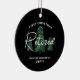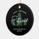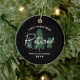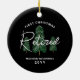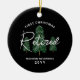 First Retired Christmas Elegant Evergreen Tree Ceramic Ornament is modern designed with a customizable black background. The text is "First Christmas Retired" in white minimal letters mixed with trendy hand lettered script. Name and custom year are on the lower center. Three winter evergreen trees are on middle and was created from personal art. Perfect keepsake gift for retirement!