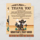 First Rodeo cute cowboy baby horse birthday party thank you card, adorable brown baby horse in a cowboys hat and decorated saddle on Arizona landscape for cowboys western themed birthday party.